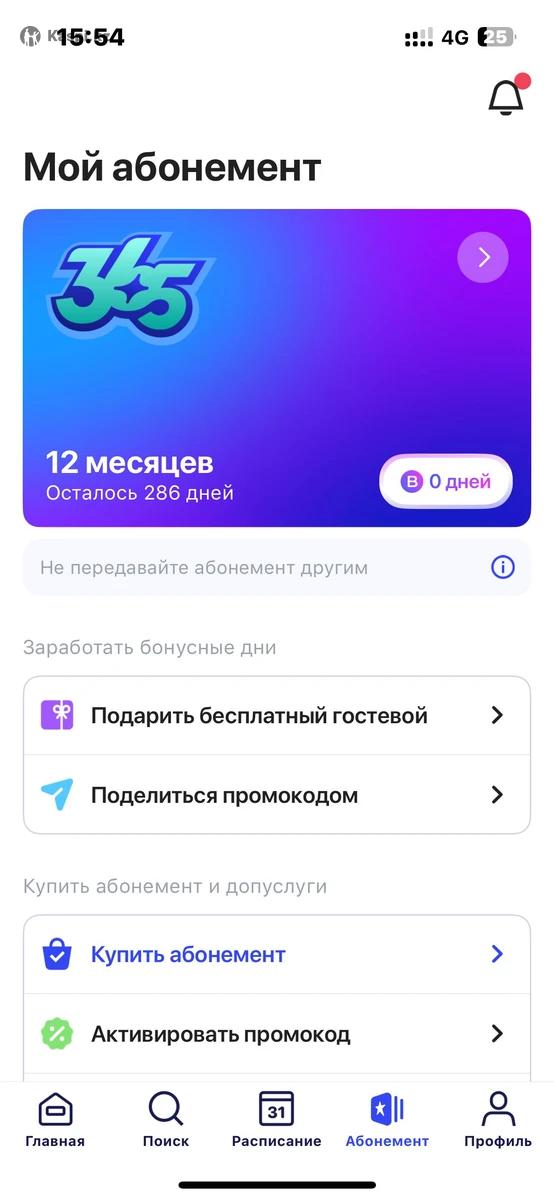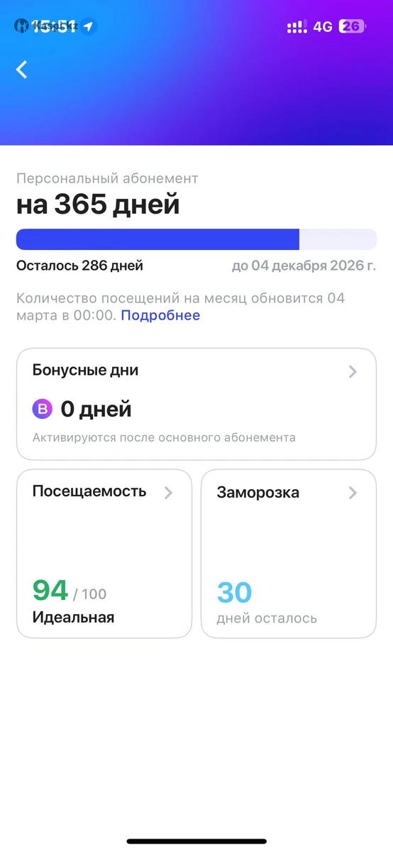 Годовой абонемент 1fit осталось: 286 дней Заморозок: 30 дней Контакт для связи: