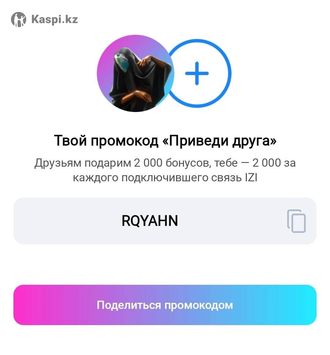 Для новых абонентов ИЗИ/IZI , промокод на 2000 бонусов. Подключай при регистрации нового номера или переносе своего старого номера. RQYAHN