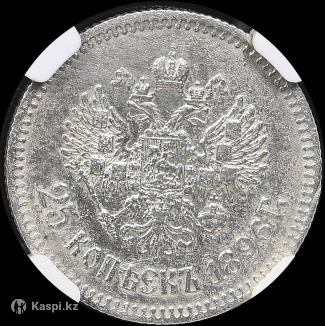 25 копеек 1896 года — Николай II, Российская Империя Сертифицирована NGCAU - Номинал: 25 копеек - Год выпуска: 1896 - Правитель:Николай II - Монетный двор: Санкт-Петербургский (СПБ) - Материал: серебро 900 пробы - Вес: 5,0 г - Диаметр: 24 мм - Гурт: рубчатый Аверс: Бюст императора Николая II в профиль, обращен вправо. По окружности — надпись: Б. М. НИКОЛАЙ II ИМПЕРАТОРЪ И САМОДЕРЖЕЦЪ ВСЕРОСС. Реверс: Государственный герб Российской Империи — двуглавый орел с регалиями и щитами на крыльях. Под гербом — номинал 25 КОПѢЕКЪ 1896 Г. Монета чеканилась в начале правления Николая II и является представителем серебряной разменной монеты конца XIX века. В хорошей сохранности пользуется стабильным интересом среди коллекционеров.