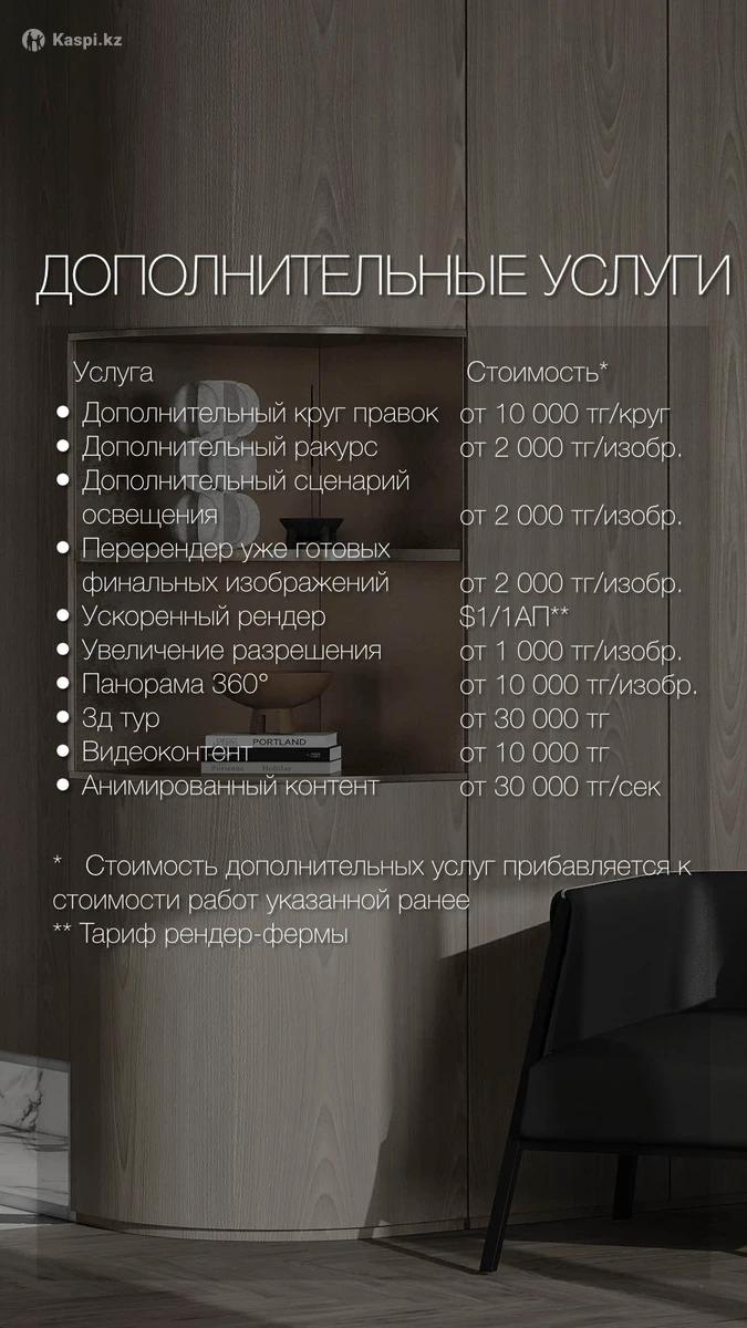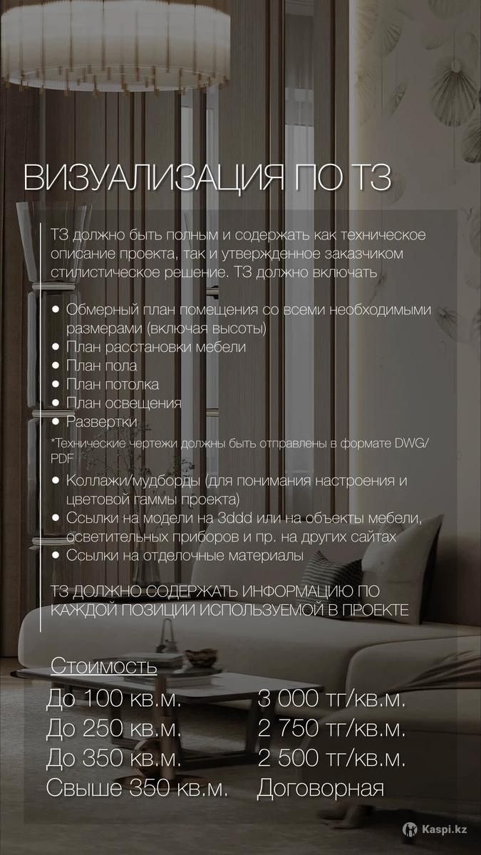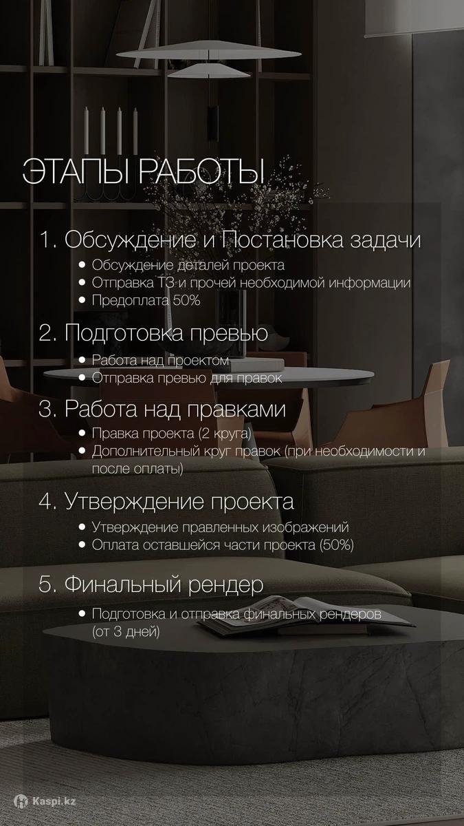 Создам качественную и детализированную 3D-визуализацию интерьера, с хорошо проработанными материалами, реалистичным освещением и правильной атмосферой. Работаю в 3ds Max + Corona Render. Форматы работы: •По чёткому ТЗ — услуга визуализация, если у вас уже есть полное представление о том, что вы хотите увидеть на визуализации. Стоимость от 2500 тг за м². •По общим референсам — услуга дизайн + визуализация, если помимо визуализации нужно проработать полный концепт интерьера с нуля. Стоимость от 4500 тг за м². Что я предлагаю: •Стандартная 3D-визуализация •Панорамы интерьера 360° •Виртуальные туры •Анимация Работаю удалённо. Все представленные работы — мои собственные. Пишите, чтобы обсудить ваш проект и уточнить детали.