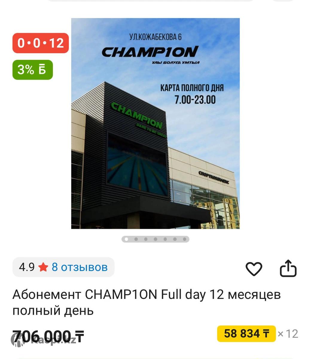 Абонемент Champ1on Продаю абонемент в зал Champ1on (рядом Мега Алматы) Действителен до 15.06.26 5 гостевых Анализ тела на Inbody Большой светлый бассейн, хамам, тренажерный зал, групповые программмы Просторно, красиво и уютно