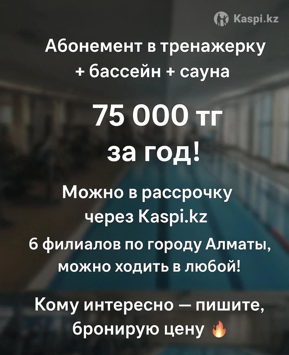 Абонемент в тренажерку + бассейн + сауна Всего 75 000 тг за год! Можно в рассрочку через 6 филиалов по городу Алматы, можно ходить в любой! Кому интересно — пишите, бронирую цену 🔥 Осталось 8 мест!