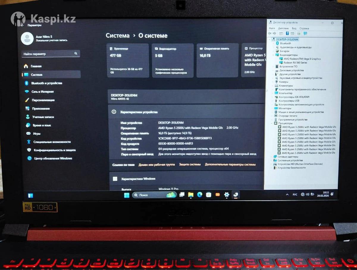 Игровой Acer Nitro5 в идеальном состоянии 10/10! Всё ножки эмблема, наклейка на месте! Ноутбук для игры и для сложных программ. Не шумит, не греется, батарея держит 4 5 часов! Самый тихий ноутбук своей версией! Всё что фотографиях есть! Быстрый запуск 5-7 секунд! В комплекте: +Новый Сумка, беспроводная мышка и коврик ! Ноутбук,Зарядка оригинал Шнур питание и книжки! Характеристика: Мощный Процессор: Ryzen 5 2500U Частота: 2.00 ghz +turboboost! Ядра: 4×8 логических поток! Память: SSD NVME 512 gb Оперативный Память: RAM OZU 16 gb Видеокарта: Reteon Rx560x=1650 4 gb! + Amd Reteon Graphics Vega 8 1 gb! Разрешение: 1920x1080! FULL HD WV. RGB Nitro клавиатура с подсветкой! Всё порты есть: HDMI, TAPE SY, LAN, веб-камера, микрофон, гнездо для Наушник, USB 3.2 1 синий, USB 3.0 2 высокоскоростной, WiFi, Bluetooth и тд Windows 11 pro обновлённый! В каспимагазине стоит 400К Просто так не беспокоить! Цена прилично и окончательно!