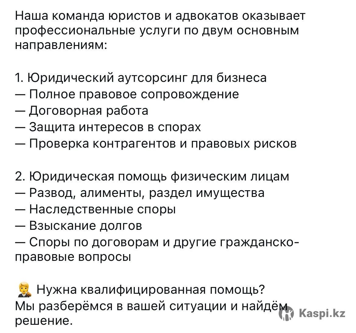 1.Юридическая помощь физическим лицам - Развод, алименты, раздел имущества — Наследственные споры — Взыскание долгов — Споры по договорам — и другие юридические вопросы 2. Юридический аутсорсинг для бизнеса — Полное правовое сопровождение - Договорная работа — Защита интересов в спорах — Проверка контрагентов и правовых рисков • Нужна квалифицированна помощь? Мы разберемся в вашей ситуации и найдем решение. Консультации платные от 10 000 тенге.
