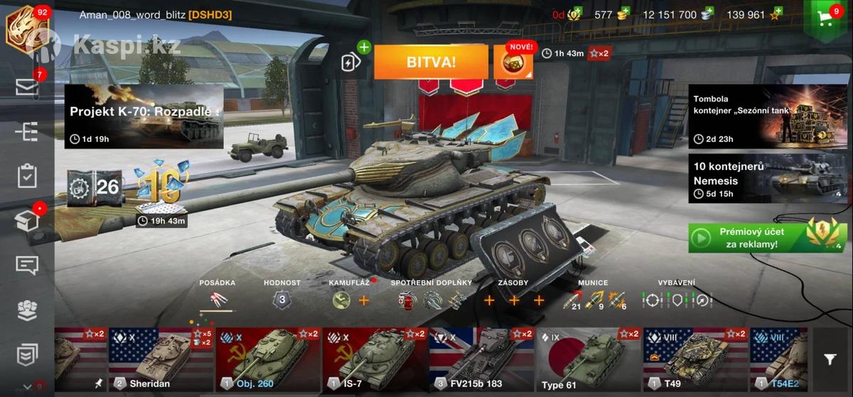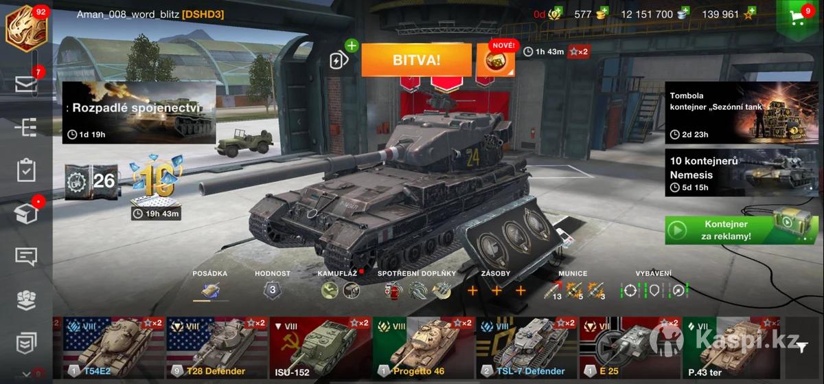 РЕСУРСЫ (вверху экрана): Золото: 62 Кредиты (серебро): 6,206, Свободный опыт: 32,331 Боевые задания: есть 2 активных (таймеры) Контейнеры и события: Британский контейнер x10 Розыгрыш «Огромный сюрприз» Цепочка наборов Возможность получить золото и премиум за просмотр рекламы ТАНКИ в ангаре: 1. TSL-7 Defender (VIII, СССР) – Премиум тяж с барабаном, уникальный стиль. 2. T28 Defender (VIII, США) – ПТ-САУ с барабаном, мощная броня. Другие танки (по уровню и нации): Progetto 65 (X, Италия) – ТТ с авто-релоадером. T49 (IX, США) – ЛТ с фугасницей. ИСУ-152 (VIII, СССР) – ПТ с огромным альфа-уроном. STA-1 (VIII, Япония) – СТ с хорошей точностью. KB-2 (VII, СССР) – Известен из-за фугасной пушки. Sherman Firefly (VI, Великобритания) – СТ с точной пушкой. Chi-To (VI, Япония) – СТ с ДПМ. Sheridan (X, США) – ЛТ с ПТ-пушкой. T57 Heavy (X, США) – ТТ с барабаном. ИС-7 (X, СССР) – Классический ТТ с хорошей броней. FV215b 183 (X, Британия) – Легендарная ПТ с альфой 1600. Объект 260 (X, СССР) – Редкий ТТ, продвинутый. T110E5 (X, США) – Сбалансированный ТТ