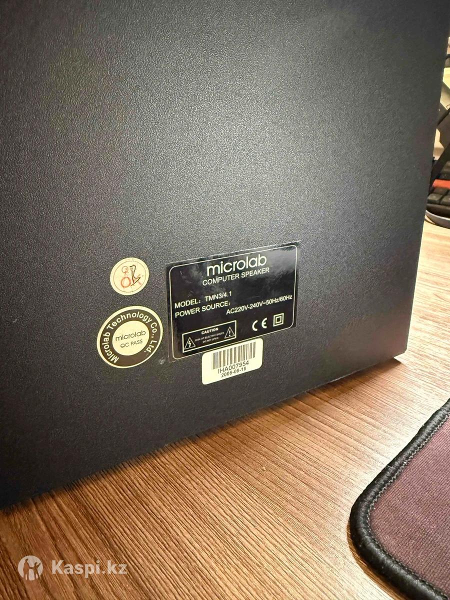 Акустическая система Microlab 4.1 - сабвуфер + 4 сателлита. Всё работает, состояние хорошее. Подключение через 3.5 мм jack. Отлично подойдёт для ПК или ноутбука - звук объёмный и с хорошим басом для своего класса.