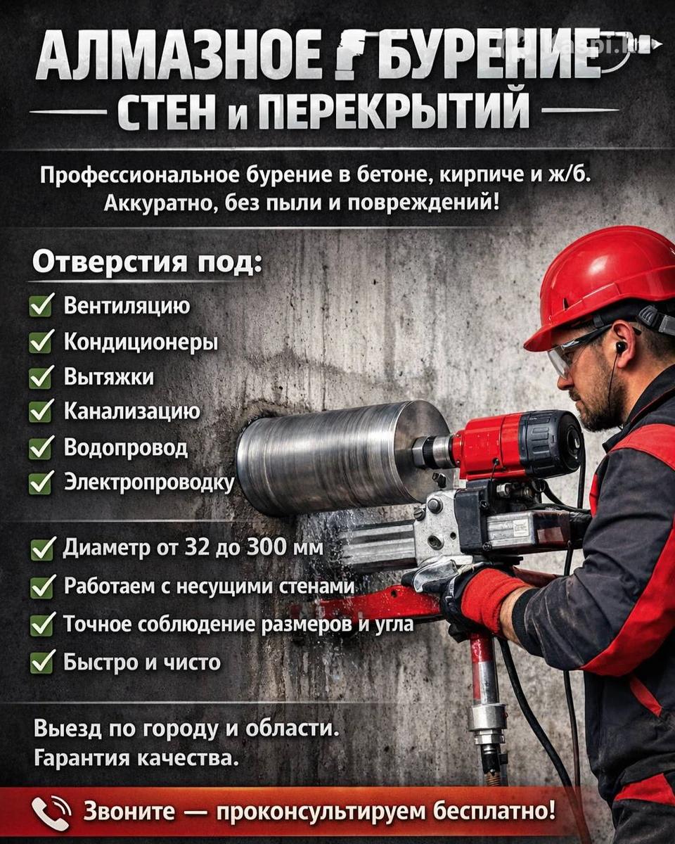 Профессиональное бурение отверстий в бетоне, кирпиче и железобетоне любой сложности. Работаем аккуратно, без лишней пыли и повреждений! ✅ Отверстия под: вентиляцию кондиционеры вытяжки канализацию водопровод электропроводку ✔ Диаметр от 32 до 300 мм ✔ Работаем с несущими стенами ✔ Точное соблюдение размеров и угла ✔ Быстро и чисто Выезд по городу и области. Гарантия качества. 📞 Звоните — проконсультируем бесплатно!