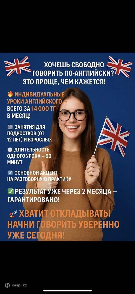 Английский, который работает! Онлайн формат, удобно , не выходя из дома. Для детей и взрослых. Стоимость 1000 тг Свободно говорите – без зубрежки, только практика. Гибкий график – учитесь когда удобно Индивидуальный подход – программа под ваши цели (путешествия, работа, экзамены). Первый урок – бесплатно! --- Коротко, ярко, по делу. Можно адаптировать под свою аудиторию (дети, бизнес, ЕГЭ). Пишите на ,буду Рада ответить на все вопросы)