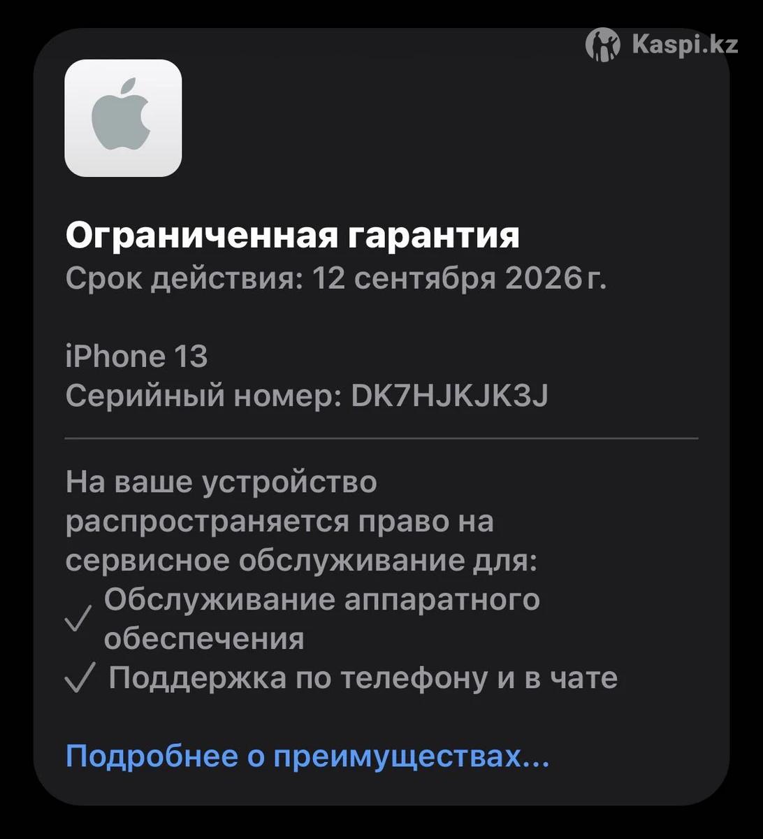 Продам iPhone 13, 128 GB, белый Состояние отличное, работает идеально. Аккумулятор 98% Гарантия до 12.09.2026 год. Чехлы в подарок Face ID, True Tone — все на месте В комплекте только телефон (без коробки и аксессуаров) Телефон без ремонтов, не вскрывался, iCloud чистый — выйду при вас. Использовался аккуратно, без жестких падений. Цена: 240 000 тг