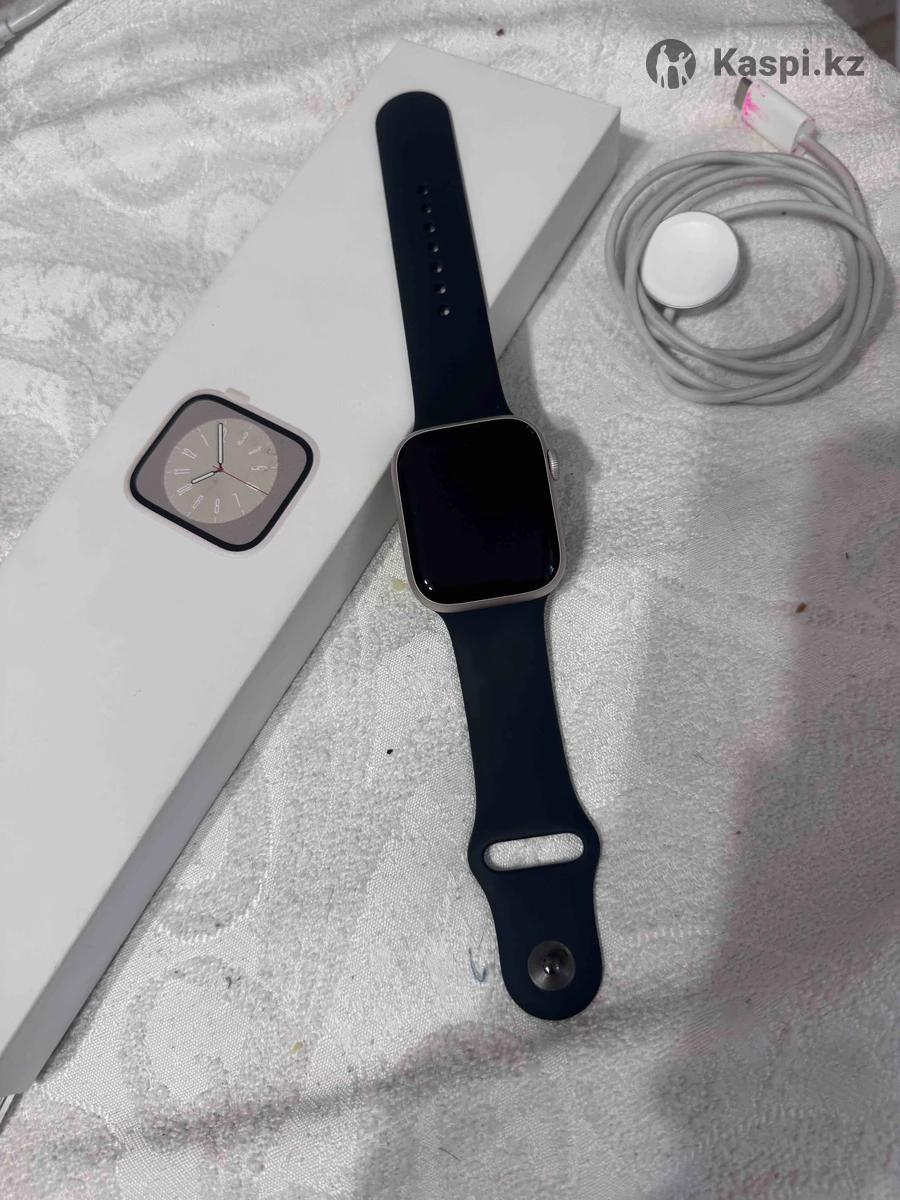 Apple Watch 8 серия, новая идеальное состояние, аккумулятор 100% 2-3 раза носили. В комплекте идет все, бежевая-черная ремешки в расцветках. Характеристики: •Модель: Apple Watch Series 8 •Аккумулятор : 100% •Размер корпуса: 45 мм •Цвет: Silver (Бежевый) •Подключение: GPS •Совместимы с iPhone •Быстрая магнитная зарядка • Измерение пульса, ЭКГ, датчик температуры, отслеживание сна и тренировок •Водонепроницаемость Комплектация: •Apple Watch •Оригинальный ремешок •Кабель быстрой магнитной зарядки USB-C •Оригинальная упаковка