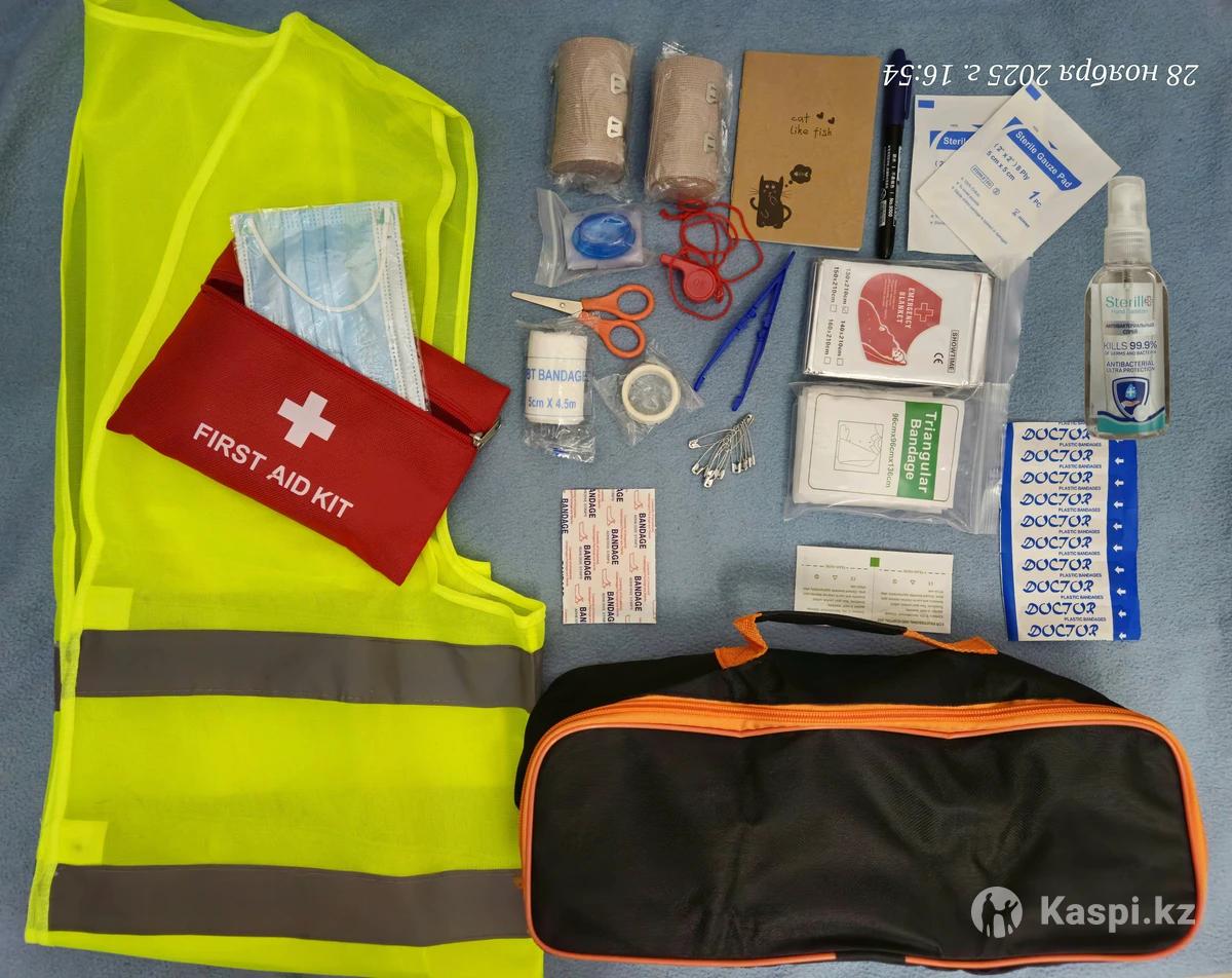 Аптечка автомобильная Сумка 35см×13см×10см Состав Одеяло фольгированное 210х130см 1 шт Антисептик спрей-1 шт Устройство для дыхания рот в рот 1шт Бинты для бондажа эластичные с закреп 2 шт Блокнот для фиксации событий,времени,важных данных 1шт Ручка для записи -1шт Свисток -1 шт Жилет аварийный со светоотражающими полосками 1шт Пластыри 6 шт Пластырь бандажный 1 шт Маска лицевая 1шт Салфетки спиртовые 2 шт Бинт 1 шт Пинцет 1 шт Пластырь 1шт Булавки 10 шт Стерильные бинты на рану 2шт Ножницы 1 шт Бинт бандажный белый 1шт Кейс для лекарств 1шт