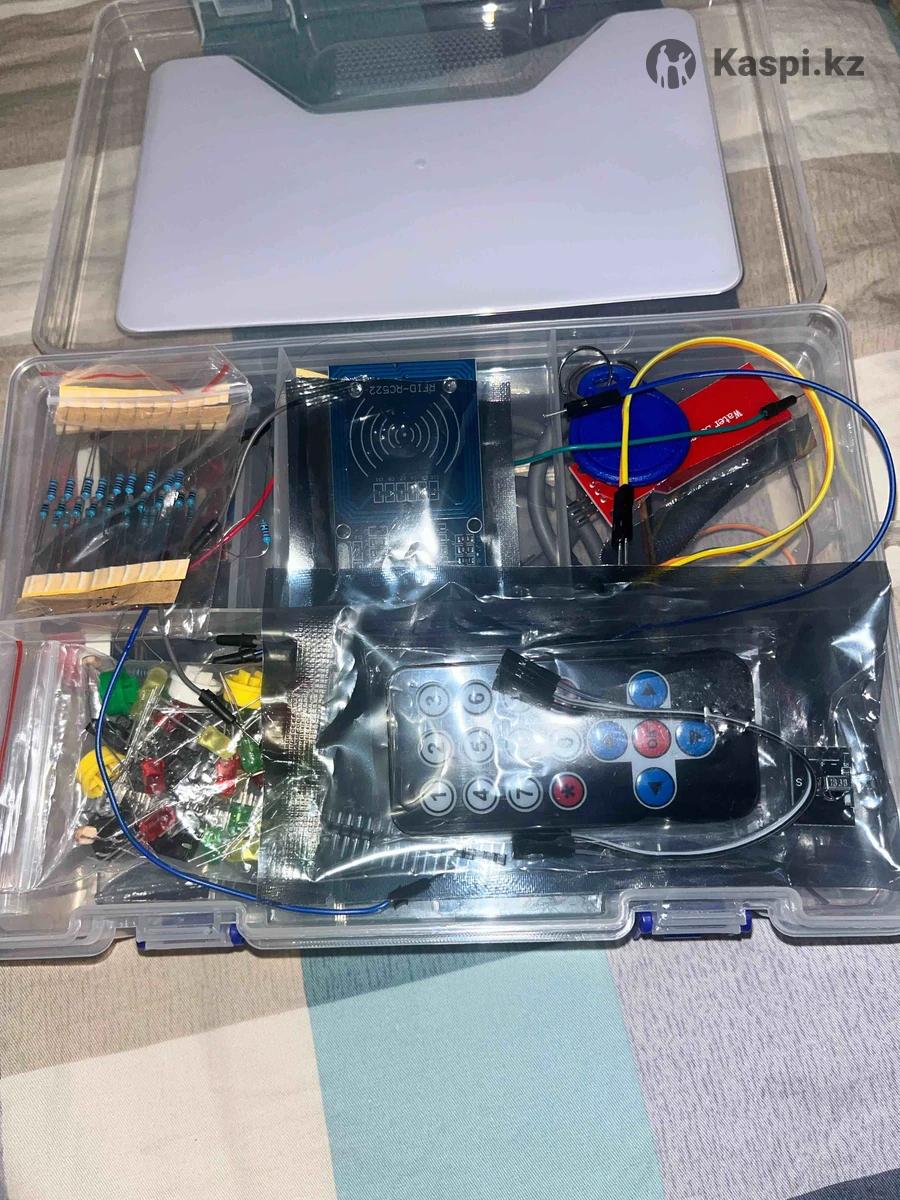Качество хорошая, отсутствует не которые компоненты Обучающий набор для проектов Arduino (UNO R3) - комплект для начинающего электронщика. Подойдет для изучения азов робототехники и программирования. Входящие в него компоненты обеспечат создание различных схем и макетов, воплощая идеи в реальность. Плата UNO R3 (Arduino-совместимый контроллер) - 1 шт Макетная плата 830 контактов - 1 шт Светодиод 5мм с цветной линзой - Испускаемый цвет: Зеленый - 10 шт Светодиод 5мм с цветной линзой - Испускаемый цвет: Красный - 10 шт Светодиод 5мм с цветной линзой - Испускаемый цвет: Желтый - 10 шт Резисторы - Сопротивление: 220 Ом; 330 Ом; 1 кОм; 10кОм по - 10 шт Провода мама-папа - 20 шт Комплект проводов 25 шт. папа-папа - 1 шт 7-сегментный индикатор (1-разрядный) - 1 шт 7-сегментный индикатор (4-разрядный) - 1 шт Светодиодная матрица 88 - 1 шт Фоторезистор - 3 шт ИК пульт - 1 шт ИК приемник - 1 шт Кнопки - 4 шт Датчик температуры и влажности DHT11 - 1 шт Сдвиговый регистр 74НС595 - 1 шт LCD Дисплей - 1 шт Шаговый двигатель 28BYJ-48 с платой управления - 1 шт Серводвигатель SG90 9G - 1 шт Датчик огня - 1 шт Клемма для 'Кроны' - 1 шт USB кабель - 1 шт Датчик вибрации - 2 шт Зуммер - 2 шт Потенциометр - 1 шт Джойстик - 1 шт Часы реального времени - 1 шт Датчик звука - 1 шт Клавиатура 4х4 - 1 шт 1-канальный модуль реле - 1 шт Датчик уровня жидкости - 1 шт RFID-RC522 - 1 шт RGB LED - 1 шт RGB модуль - 1 шт.