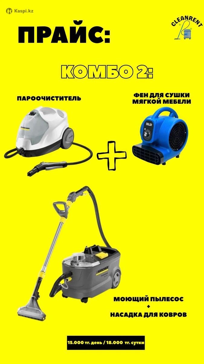 1. Пароочиститель • 7000 тг / день (8 часов) • 8500 тг / сутки Используется без химии. Новый комплект тряпок и насадок предоставляется. 2. Моющий пылесос • 8000 тг / день (8 часов) • 9500 тг / сутки Для чистки мебели, матрасов, ковров, стульев и салона автомобиля. Комплект: • 2 порции химии (доп. порция — 700 тг) • Щетка и перчатки 3. Хозяйственный пылесос • 6000 тг / день (8 часов) • 7500 тг / сутки Подходит для сухой уборки строительного мусора, пыли, гаража и т.п. 4. Робот-мойщик окон • 5 500 тг 5. Дополнительные услуги и аксессуары • Насадка для ковров — 1 500 тг • Фен для сушки мебели — 2 000 тг 6. Комбо-наборы • Пароочиститель + Моющий пылесос — 11500 тг / день (8 часов) • Пароочиститель + Моющий пылесос — 13500 тг / сутки Доставка: ✅ По Астане доставка и забор бесплатны!