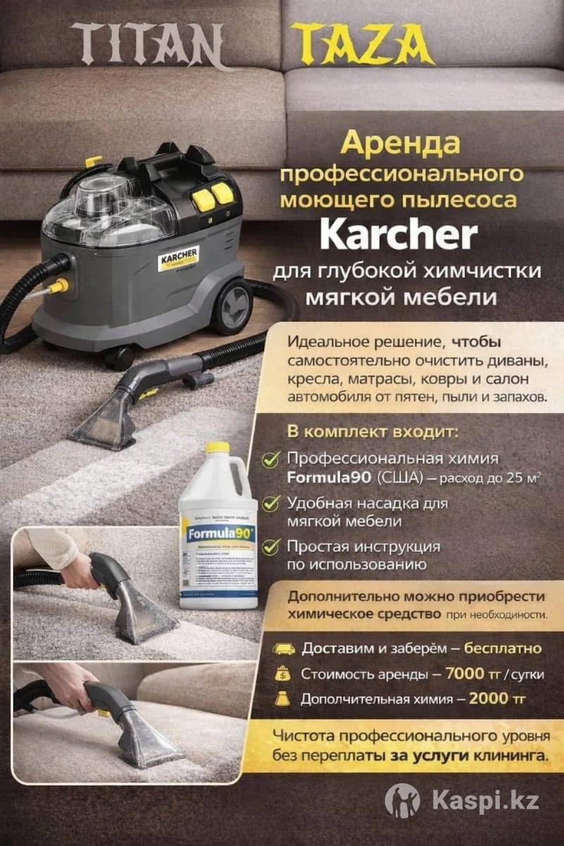 Аренда профессионального моющего пылесоса Karcher глубокой химчистки. В комплект входит химия, производство Formula90 США на 25 кв метров, так же вы можете у нас взять дополнительную химию. Доставим и заберем в черте города бесплатно! Сутки 7000тг. Доп химия 2000тг.