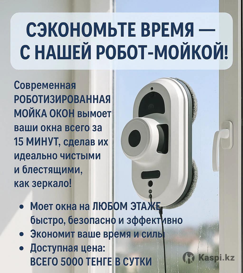 СЭКОНОМЬТЕ ВРЕМЯ — С НАШЕЙ РОБОТ-МОЙКОЙ! Современная роботизированная мойка окон вымоет ваши окна всего за 15 минут, сделав их идеально чистыми и блестящими, как зеркало! •Моет окна на любом этаже — быстро, безопасно и эффективно •Экономит ваше время и силы •Доступная цена: всего 5000 тенге в сутки Заказать можно по номеру: Звоните или пишите в !