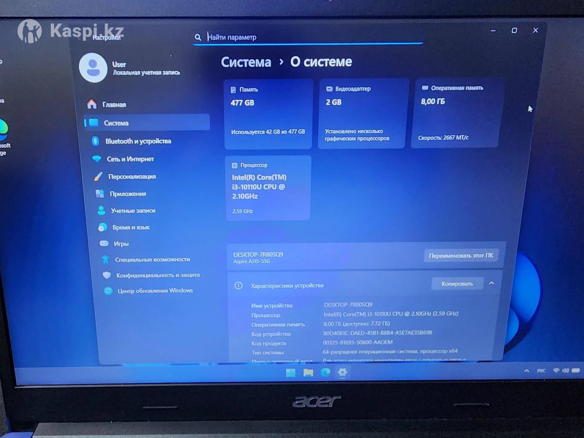 Продаю ноутбук в хорошем рабочень состоянии, комплектация ( родное зарядное устройство, сумка для переноски, документы) Причина продажи - за ненадобностью. Отличный ноутбук для учебы, работы и серфинга в интернете. Так же установлена свежая официальная версия Windows 11 Процессор - Intel core i3- 10110U 2.10 GHz - 2.59GHz Озу - 8 Gb фирмы Kingston SSD - 500 Gb фирмы Kingston Размер экрана - 15.6" Графический процессор - INVIDIA GeForce MX 230 Usb 2.0 - 1 шт Usb 3.1 - 2 шт HDMI и LAN порт
