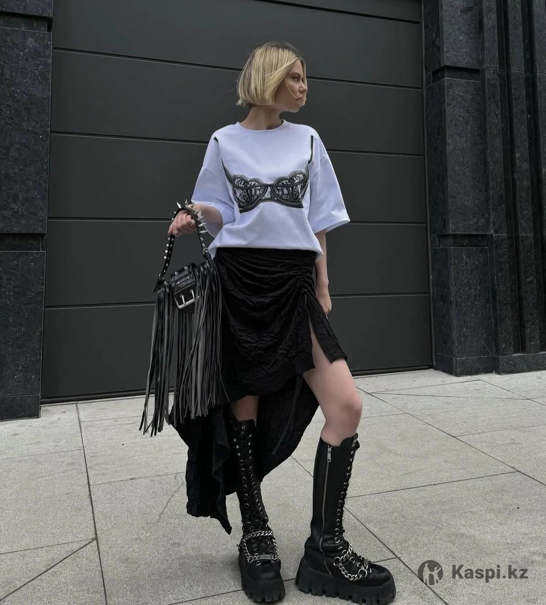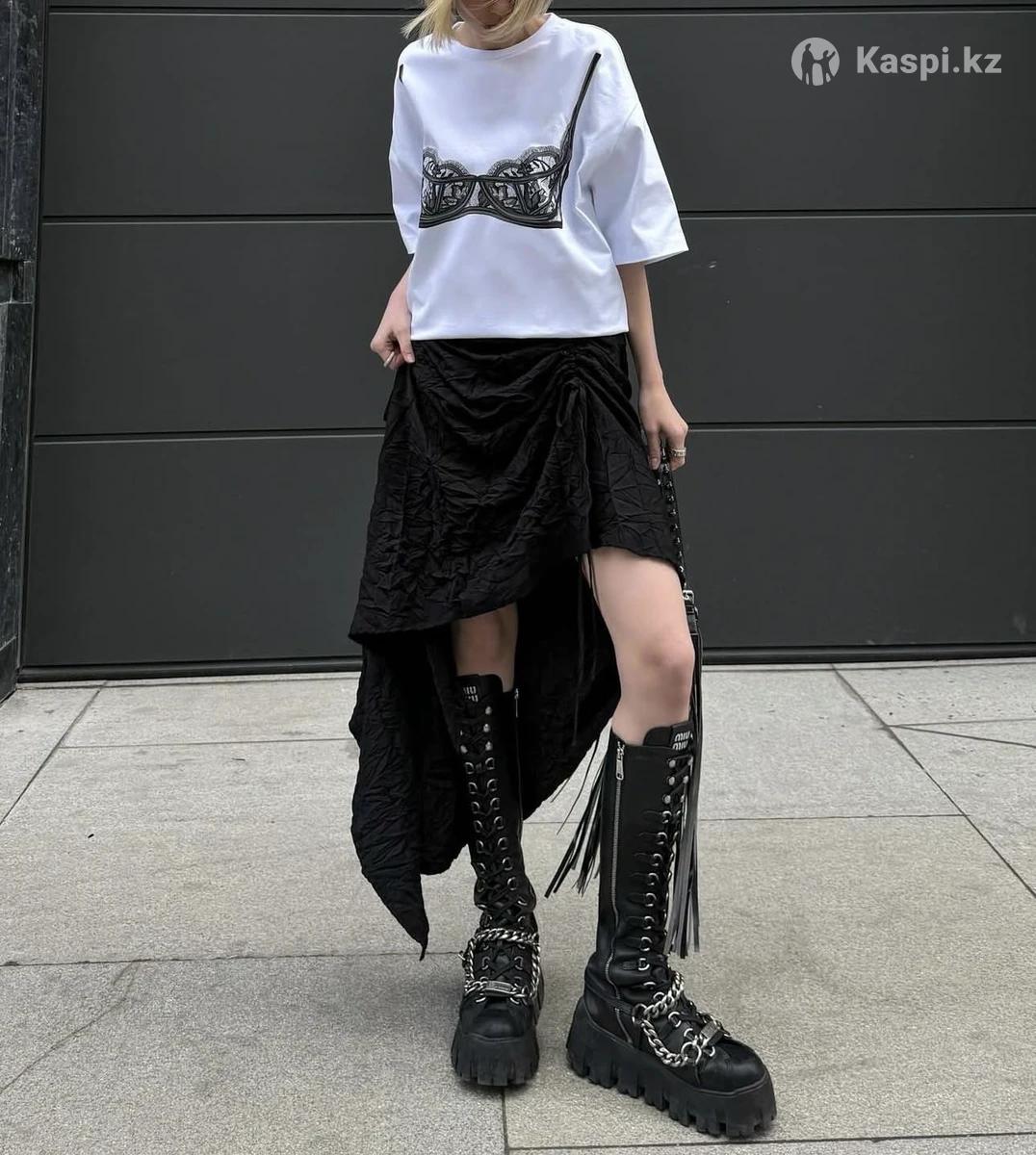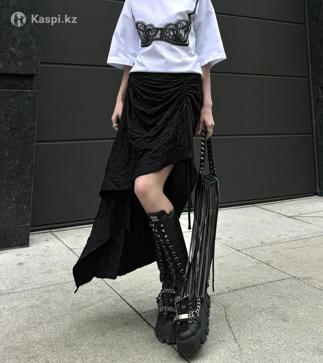 Чёрная асимметричная юбка с драпировкой. Фактурная ткань с лёгким жатым эффектом. Свободный силуэт, красиво держит объём и создаёт динамику в образе. Подойдёт для стилизаций в гранж и edgy-стиле. Размер 42-44