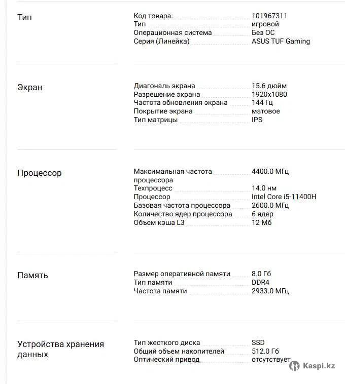 Продам ноутбук ASUS TUF Gaming F15 FX506HE в хорошем состоянии. Ноутбук полностью рабочий, без скрытых проблем, использовался аккуратно. Отлично подходит для игр, учебы, работы и монтажа. Тянет современные игры (CS2, GTA V, Warzone и др.) на средних–высоких настройках. Экран без битых пикселей, корпус без трещин. Работает стабильно, температуры в норме. Причина продажи: приобретаю ПК. В комплекте: ноутбук и оригинальное зарядное устройство. Возможна проверка при встрече. Пишите на или — отвечу на вопросы. Характеристики: Экран: 15.6" IPS, Full HD (1920×1080), 144 Гц, матовый Процессор: Intel Core i5-11400H (6 ядер, до 4.4 ГГц) Видеокарта: NVIDIA GeForce RTX 3050 Ti, 4 ГБ GDDR6 Оперативная память: 8 ГБ DDR4 Накопитель: SSD 512 ГБ Wi-Fi 6, Bluetooth 5.2 Подсветка клавиатуры: есть Камера: HD 720p Вес: 2.3 кг Дополнительно (по желанию, за доплату): — Охлаждающая подставка Deepcool Multi Core X6 - 6000 тг — Игровая мышь Logitech G102 - 4000тг — Игровая мышь Bloody V5M - 3500тг — Игровая мышь HyperX Pulsefire Surge - 4000тг Можно выбрать любой аксессуар отдельно или договориться по комплекту.
