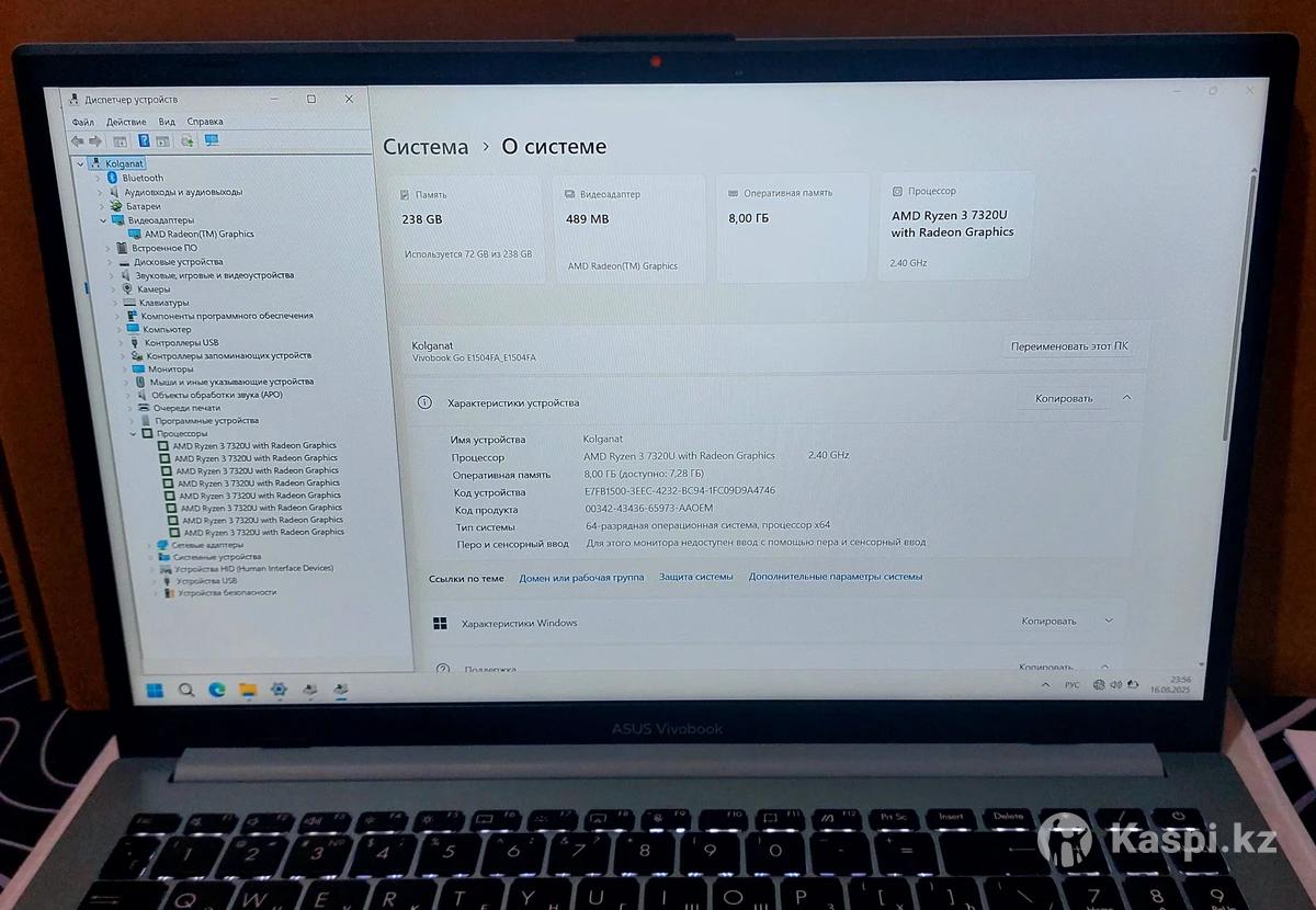 Asus VivoBook Ryzen 7 поколение новый состояний! 10/10 100 % Коробка, документы и чек имеется! Windows 11 pro куплен с лицензией 2024 год! Лучше чем Процессор core I 5 13 поколения. Не шумит, не греется, батарея держит отлично 5 7 часов! Все что фотографиях есть! Включение очень редко, для проверки! В комплекте: Коробка, книжка, документы и чек Ноутбук,Зарядка оригинал в пленке! Клавиатура с подсветкой. Веб камера с защищенный от хакеров! Характеристика: Asus VivoBook Ryzen 7320U 2.40 ghz + turbo boost 4,50 Ядро 8 поток ускоростной мощный! Ssd NVME 2 256 gb новый поколение озу 8 gb + до 32 гб можно! Экран: IPS OLED Графика: Full HD WV Разрешение: 1920x1080! Высокое качество изображения! Windows 11 pro с лицензия Все порты есть: USB 3.2 2, TAPE SY, HDMI для трансляции и тд... Цена прилично просто так не беспокоить! Окончательно!