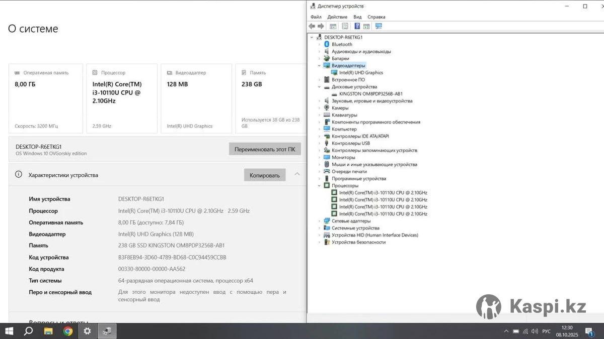 Ноутбук в отличном состоянии. Корпус без трещин и сколов. От батареи работает больше 4х часов в режиме просмотра видео. От пыли почищен, работает без перегревов. Установлена Windows 10 Pro, необходимые программы и антивирус. Хорошо подойдет для офисной работы, работы в интернете и учебы. Потянет нетребовательные игры. Комплектация: ноутбук и зарядное устройство. Технические характеристики: -процессор Intel Core i3-10110u -оперативная память 8Гб -ssd m2 диск 256Гб --интегрированная графика intel Uhd 600 -дисплей FullHd. Без торга и обмена!