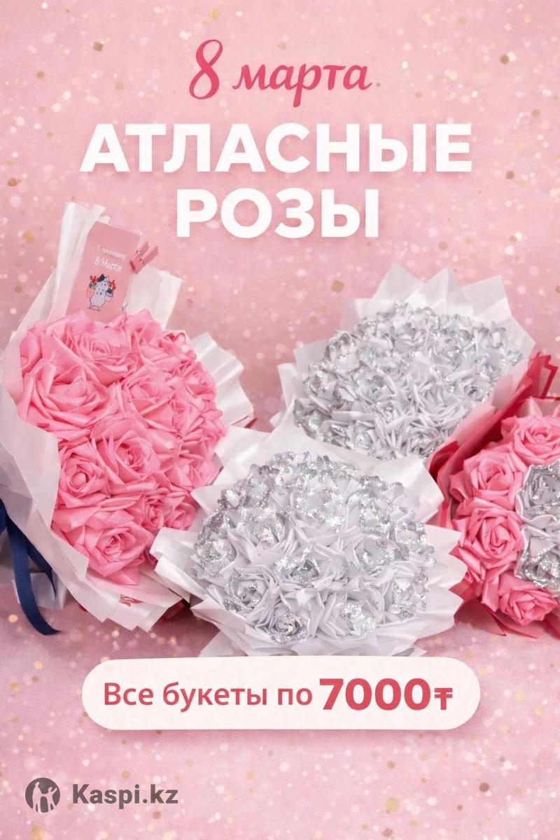 Красивые букеты из атласных роз к 8 марта. В каждом букете 17–19 роз, букет выглядит объемно и аккуратно. Есть разные вариации: розовые, белые с блеском и комбинированные. К каждому букету можно выбрать открытку. В наличии более 100 разных открыток. Все букеты по одной цене — 7000тг. Букеты аккуратно упакованы и готовы для подарка. Количество ограничено.