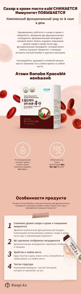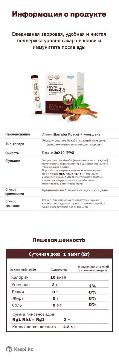 Листья Банабы веками использовались для лечения диабета в народной медицине. В дополнение к своим антидиабетическим свойствам они обладают полезными для здоровья свойствами, такими как антиоксидантные, снижающие уровень холестерина и эффекты от ожирения. Экстракты листьев банабы и красный женьшень одновременно выполняют две функции, помогает подавить постпрандиальное повышение уровня сахара в крови и улучшить иммунную систему. Повышение иммунитета, снижение усталости, улучшение памяти и улучшение антиоксидантной функции. Артериальное давление. Состав Концентрат красного женьшеня (4-летний корень, Rgl, Rbl1 и Rg3 15 мг/г) 2,8% (корень красного женьшеня 70%, красный рисовый женьшень 30%) Способ применения 1 пакетик 1 раз в день