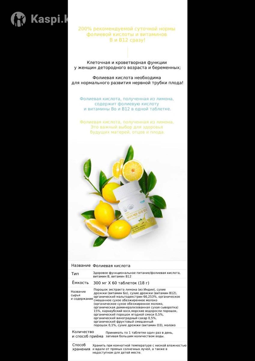 Фолиевая кислота от Атоми - это уникальная биологически активная добавка для здоровья будущих мам и и их детей. Она способствует нормальному развитию нервных трубок плода, а также поддерживает здоровье матерей и их малыша. Каждая упаковка содержит 60 таблеток, что соответствует двухмесячному курсу приема. Преимущества: 200% суточной нормы: Каждая таблетка содержит 800 мкг фолиевой кислоты, что превышает рекомендуемую суточную норму. Натуральный экстракт: Получена из лимона, что обеспечивает органичность и высокое качество. Дополнительные витамины: Обогащена витаминами B6 и B12, что способствует выработке клеток крови. Комплексный состав: Входит в состав 14 органических веществ, среди которых гранат, черная смородина, и многие другие. Подробный состав товара Каждая таблетка содержит: Экстракт лимона Витамин B6 (пиридоксин) Витамин B12 (цианокобаламин) Органический мальтодекстрин Порошок морских водорослей Сухие экстракты ягод и фруктов: клубника, малина, черника и другие. Инструкция по применению Важно принимать по 1 таблетке в день, запивая достаточным объемом воды. Рекомендуется начинать прием с момента планирования беременности.
