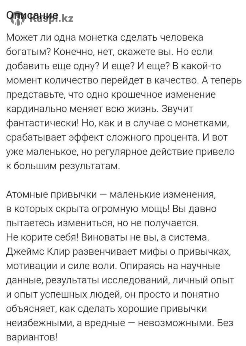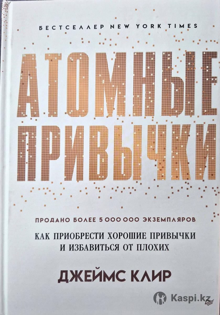 Твердый переплет Доставка по Казахстану 2000 тг. Основная идея: Книга акцентирует внимание на том, что маленькие, но последовательные изменения могут привести к значительным результатам в долгосрочной перспективе. Автор называет эти маленькие изменения "атомными привычками”. 2. сила накопления: джеймс клир объясняет, как постепенное улучшение на 1% каждый день может значительно повысить качество жизни за год. Это помогает понять, что не обязательно сразу достигать больших целей, зажни небольшие, но устойчивые шаги. з. Система формирования привычек: Автор предлагает четкую систему для создания новых привычек v избавления от старых. она включает такие этапы как сигнал, желание, реакция и награда. Эта структура помогает понять, как работают наши привычки и как мы можем их изменить 4. Практические советы: Книга полна практических советов и техник, таких как "закон двух минут (начинать новую привычку с выполнения задания которое занимает не более двух минут и гукрепление связей" (связывание новой привычки уже существующей). 5. Среда и окружение: клир подчеркивает важность создания подходящей среды для формирования полезных привычек. Он объясняет, как наше окружение может влиять на наше поведение и как мы можем изменить его в свою пользу. б.