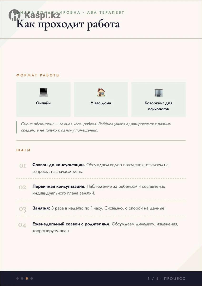 АВА-терапия для детей — индивидуальные занятия Меня зовут Диана — сертифицированный супервизор АВА. Медицинское образование (СибГМУ), психология (МТИ), практика в прикладном анализе поведения. Что включает работа: — первичный созвон с родителями и подробное собеседование о ребёнке — оценка навыков по протоколам ABLLS-R и VB-MAPP — составление индивидуальной программы под конкретного ребёнка — регулярные занятия с фиксацией прогресса на каждом этапе — обратная связь родителям и обучение домашним стратегиям — корректировка программы по мере развития ребёнка Работаю с детьми с аутизмом, задержками речи и поведенческими трудностями.