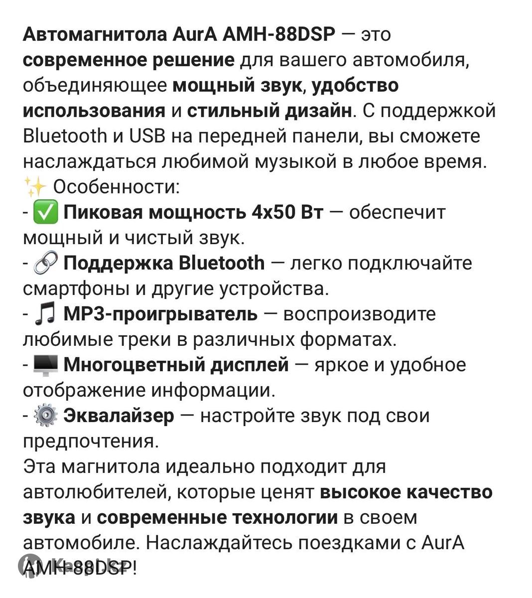 Автомагнитола AurA AMH-88DSP — это современное решение для вашего автомобиля, объединяющее мощный звук, удобство использования и стильный дизайн. С поддержкой Bluetooth и USB на передней панели, вы сможете наслаждаться любимой музыкой в любое время. 令 Особенности: - V Пиковая мощность 4х50 Вт - обеспечит мощный и чистый звук. - • Поддержка Bluetooth — легко подключайте смартфоны и другие устройства. - Г МР3-проигрыватель — воспроизводите любимые треки в различных форматах. - — Многоцветный дисплей — яркое и удобное отображение информации. - • Эквалайзер - настройте звук под свои предпочтения. Эта магнитола идеально подходит для автолюбителей, которые ценят высокое качество звука и современные технологии в своем автомобиле. Наслаждайтесь поездками с AurA AMH-88DSP!