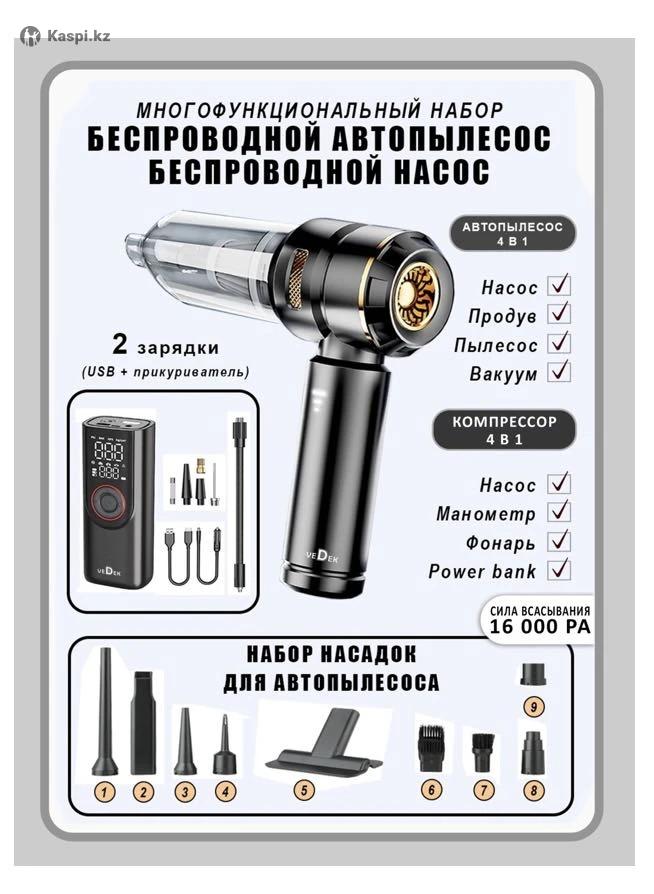 Представляем вам комплект для автомобилиста: Беспроводной Автопылесос 4 в 1 и Компрессор 4 в 1 – незаменимого помощника для вашего автомобиля, дома, офиса и дальних поездок. Главные особенности: Супер мощность: С всасывающей мощностью 16000 PA, наш автопылесос легко справляется с любыми загрязнениями. Моющийся HEPA фильтр: Легко очищается и обеспечивает долгую эксплуатацию. Функция насоса и продуваюю: Продавайте и надувайте с легкостью, будь то мячи, шарики или вакуумная упаковка. Легкий и компактный: Удобен в использовании и хранении. Три режима мощности: Выберите идеальный режим для ваших нужд, с временем работы до 30 минут. Расширенный набор насадок: В комплекте 9 насадок для различных задач. Преимущества: Многофункциональность: Подходит для уборки автомобиля, дома и офиса. Легко чистить салон автомобиля, клавиатуру, мебель и многое другое. Удобство и мобильность: Беспроводной дизайн позволяет использовать его где угодно без привязки к розетке. Эффективность: Мощное всасывание и три режима работы обеспечивают эффективную уборку любой сложности. Портативный компрессор 4 в 1: Этот портативный насос 4 в 1 станет вашим незаменимым помощником в дороге. Его функции — насос, манометр, фонарь и power bank — делают его многофункциональным и удобным для использования в различных ситуациях. Мощность и скорость накачивания, возможность использовать яркий фонарь с тремя режимами, а также функция зарядки устройств делают его универсальным и незаменимым устройством в дальних поездках. Такое устройство можно назвать настоящим спасением в случае непредвиденных ситуаций на дороге. У насоса есть две зарядки: зарядка от прикуривателя и зарядка от USB. Комплект включает: Беспроводной автопылесос с функцией насоса и продува. Беспроводной насос с функцией насоса, манометра, power bank, фонаря (2 зарядки: от прикуривателя и от USB) Большое количество насадок для детальной чистки, для вакуумного запечатывания, для накачки, для продувки.