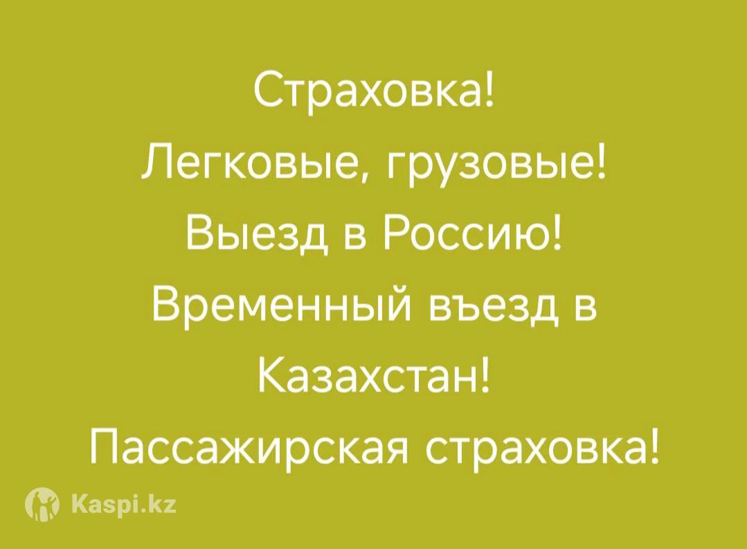 Страховка ! 1) KZ учет легковые и грузовые автомобили 2) Страхование пассажиров: 4 место - 11796 тг 7 место - 19660 тг 3) КАСКО 4) Выезд в Россию официально! 5) Страхование ТОО, ИП, КХ 6) Транзит , Росс учет, Грузия Онлайн по всему Казахстану. Электронныдык полис ПДФ жібереміз.