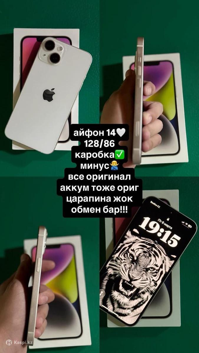 Продаю iPhone 14 | 128 ГБ | Состояние хорошее Память: 128 ГБ Состояние: хорошее, все работает отлично В комплекте: оригинальная коробка Face ID, True Tone, камера, заряд держит — всё в порядке Телефон не вскрывался, все родное Емкость аккумулятора:86% Цена: 175 тенге (возможно торг) обмен есть!!!