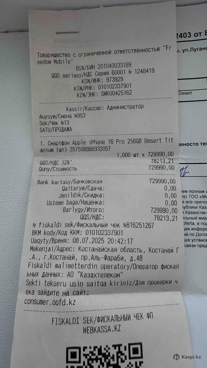 Продам айфон 16 pro 256 gb в отличном состоянии, в ремонте небыл, куплен в июле 2025 года за 990 тг., тгбережная эксплуатация, без царапин и сколов, аккумулятор 93%. Торг небольшой!