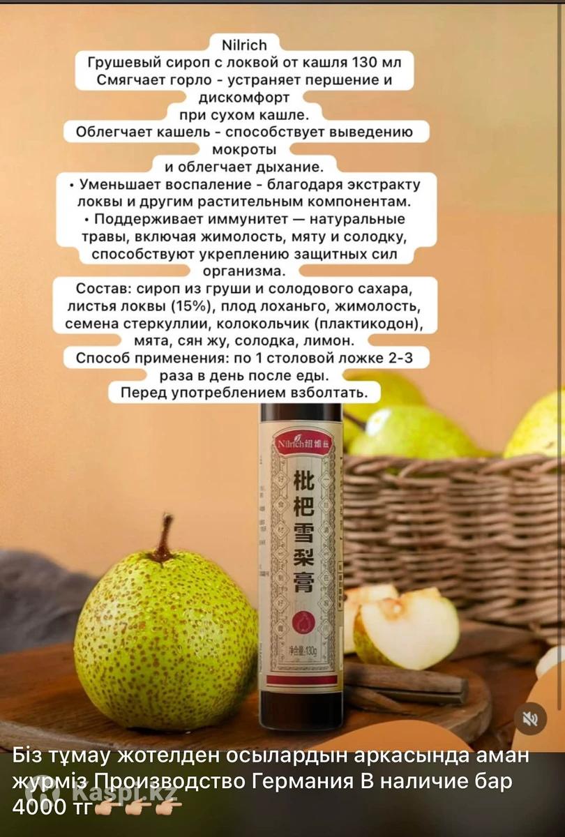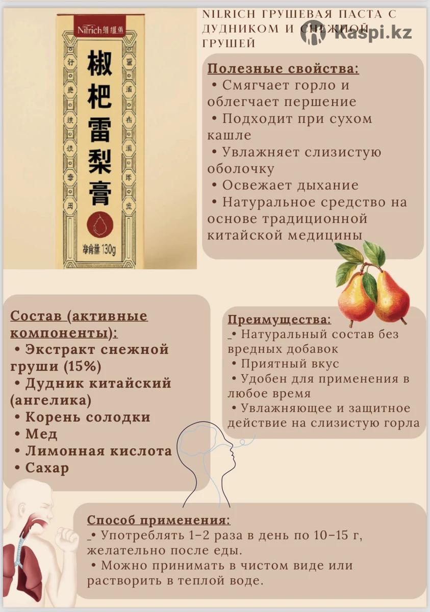 Nilrich Грушевый сироп с локвой от кашля 130 мл Смягчает горло - устраняет першение и дискомфорт при сухом кашле. Облегчает кашель - способствует выведению мокроты и облегчает дыхание. • Уменьшает воспаление - благодаря экстракту локвы и другим растительным компонентам. • Поддерживает иммунитет — натуральные травы, включая жимолость, мяту и солодку, способствуют укреплению защитных сил организма. Состав: сироп из груши и солодового сахара, листья локвы (15%), плод лоханьго, жимолость, семена стеркуллии, колокольчик (плактикодон), мята, сян жу, солодка, лимон. Способ применения: для взрослых по 1 столовой ложке 2-3 раза в день после еды. Для детей от 3 лет 1 чайный ложка 2 раза в день после еды. Перед употреблением взболтать.