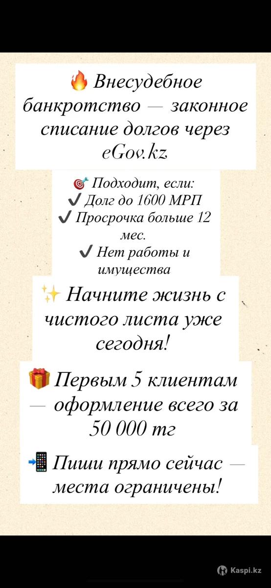 Внесудебное банкротство — списание долгов Законная процедура через Без суда и управляющего Быстро и безопасно Кому подходит: •Долг до 1600 МРП •Просрочка более 12 месяцев •Нет работы и имущества Начните жизнь с чистого листа уже сегодня! Акция: первым 5 клиентам оформление всего за 50 000 тг Для консультации пишите в
