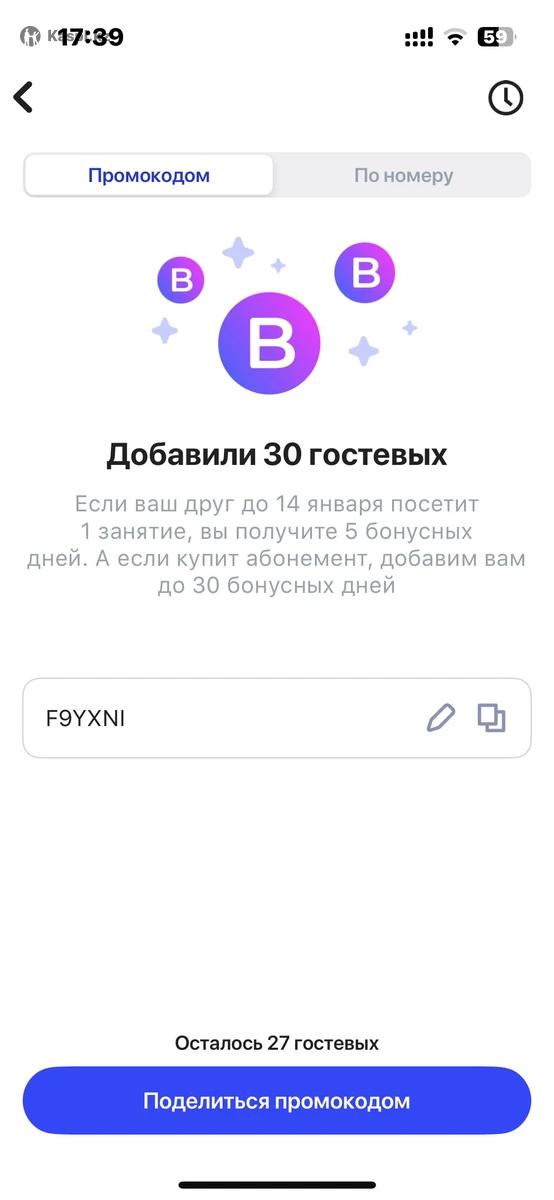 Добавили 30 гостевых до 14 января. Бесплатно можете посетить любое занятие по 1фит ( йога танцы бассейн фитнес и тд ) Промокод F9YXNI Использовать надо в течении недели Вам нужно зайти зарегистрироваться, зайти в раздел «АБОНЕМЕНТ» далее «активировать промокод» после активации промокода сразу будет подключен гостевой
