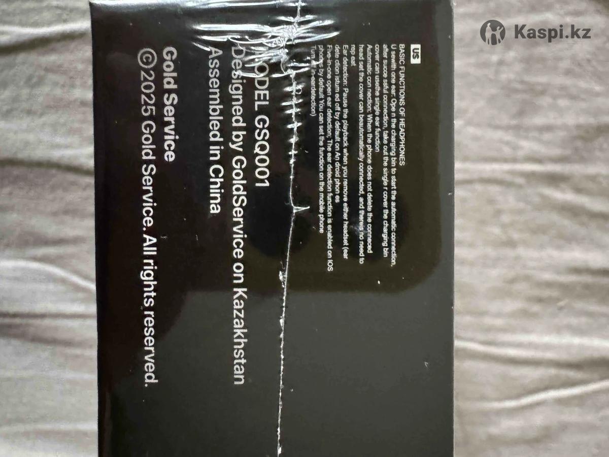 Изображение демонстрирует упаковку беспроводных наушников Gold Service модели GSQ001. Модель: GSQ001 Разработано компанией GoldService в Казахстане Собрано в Китае Поддерживает функции использования с одним ухом, автоматического подключения и обнаружения уха. Перевод ОСНОВНЫЕ ФУНКЦИИ НАУШНИКОВ Использование с одним ухом. Откройте зарядный отсек, чтобы начать автоматическое подключение; после успешного подключения выньте одиночный наушник, закройте крышку отсека и сможете использовать функцию одного уха Автоматическое подключение: Если телефон не удалял подключенные наушники, после открытия крышки они автоматически подключатся, и повторять процедуру не потребуется Обнаружение уха: Приостанавливает воспроизведение, когда вы снимаете любой из наушников (функция обнаружения уха по умолчанию отключена на телефонах Android; на телефонах IOS функция обнаружения уха по умолчанию включена. Вы можете настроить эту функцию в мобильном телефоне (Включить обнаружение в ухе)) МОДЕЛЬ GSQ001 Разработано GoldService в Казахстане Собрано в Китае Gold Service ©2025 Gold Service. Все права защищены.