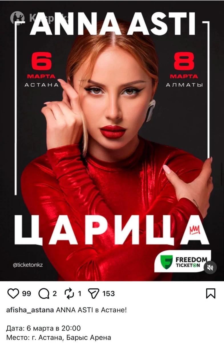 Продам билет на концерт Anna Asti 🎶 📍г. Астана, Барыс Арена 📅 Дата: 6 марта, 20:00 🎟️ Место: сидячее