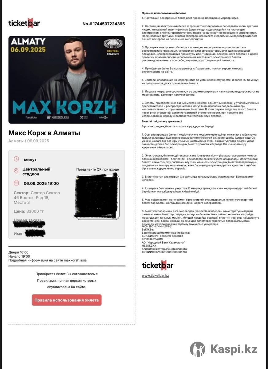 Билеты на концерт Макса Коржа, 6 сентября 2025 года, в г. Алматы, в наличии 4 билета, можно купить как один так и все 4, продаю по семейным обстоятельствам. Не получается сходить, есть торг. Места: Сектор 46, Ряд 18, Места 3,4,5,6