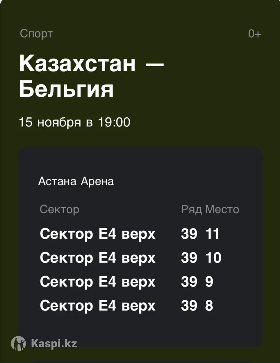 Продаю 4 билета на матч Казахстан — Бельгия. Цена: 15 000 тенге за билет. Места хорошие, билеты настоящие. Обмануть не собираюсь — всё честно и по факту. Пишите, пока есть билеты.