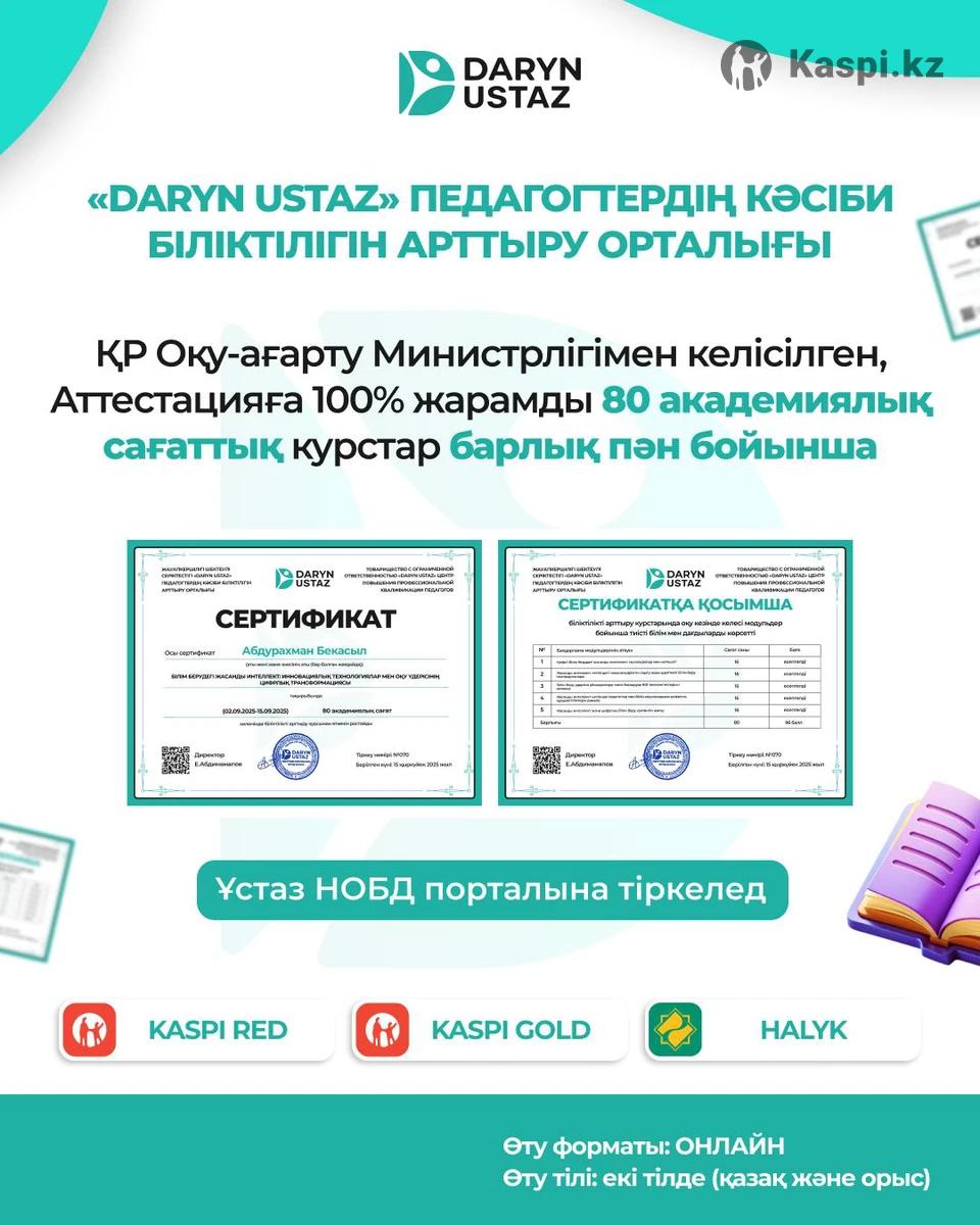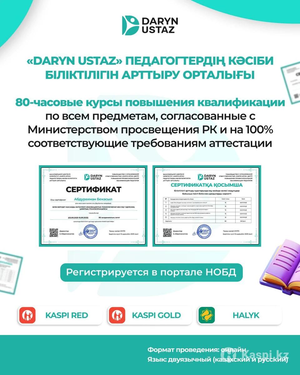 Біліктілікті арттыру курстары (80 сағат) Аттестациядан сенімді өту үшін 80 сағаттық онлайн біліктілікті арттыру курсына шақырамыз. 📍 Алматы, «Daryn Ustaz» орталығы 💳 Бағасы: 19 990 тг Курс артықшылықтары: ✔ ҚР Оқу-ағарту министрлігінің 95-бұйрығына сәйкес ✔ НОБД және USTAZ порталына тіркеледі ✔ 3 жылға жарамды сертификат Курстар келесі бағыттар бойынша өтеді: 📚 директорлар мен басшыларға арналған курстар 📚 барлық пән мұғалімдеріне арналған курстар 📚 инклюзивті білім беру 📚 жасанды интеллект (AI) құралдары 📚 жаһандық құзыреттілік және басқа да бағыттар 🎁 Егер ұжымыңыздан 5 педагог бірге қатысса — арнайы жеңілдік қарастырылған. Толық ақпарат алу үшін хабарласыңыз.