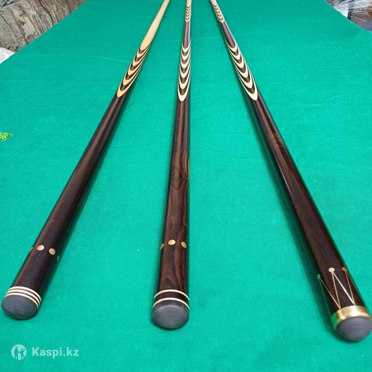 Кии из эбенового дерева +белый граб. Двух составные. На фото с права на лево:1- модель "Лангони" 10 запилов, инкрустация "Золотой шар". 200 000тг. 2- Пламенный эбен- классика, 21 запил , инкрустация" Золотой шар" -300 000тг. 3- Отборный черный эбен 21запил- классика, инкрустация "Золотая корона" 400 000тг.