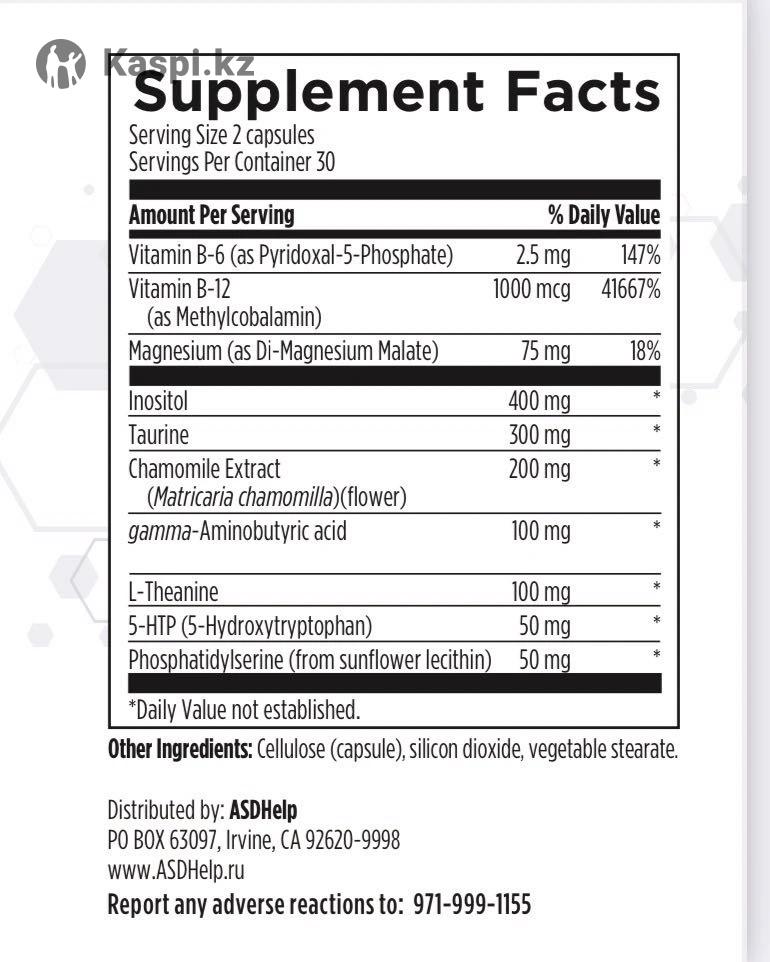 Brand: ASDHelp Supplements Нейро калм предназначен для стимулирования активности гамма-аминомасляной кислоты (GABA) и серотонина, которые могут помочь поддержать здоровое настроение, тягу и чувство спокойствия, сытости и удовлетворения. содержит PharmaGABA®️, форму ГАМК, полученную естественным путем процесса ферментации, который считается более эффективным, чем химически произведенные синтетические формы. Поддержка производства успокаивающих нейротрансмиттеров также обеспечивается L-теанином и таурином