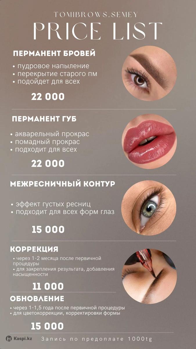 🤍 БРОВИ ✨ Долговременная укладка + архитектура — 8.000тг (вместо 10.000тг) ✨ Архитектура бровей — 6.000тг ✨ Коррекция восковая — 3.500тг ⸻ 💄 ПЕРМАНЕНТНЫЙ МАКИЯЖ 🌷 ПМ бровей — 22.000тг 🌷 ПМ губ — 22.000тг 🌷 ПМ век — 12.000тг ⸻ 👁 РЕСНИЦЫ 💫 Ламинирование ресниц — 8.000тг ⸻ 💖 БОНУС: Приведи подругу — и вы обе получите -2.000тг скидки на любую процедуру 🌸 ⸻ 📍 г. Семей 📲 Запись в директ inst: / : ✨ Уютная атмосфера, аккуратная работа, материалы премиум-класса — и результат, который радует каждый день.