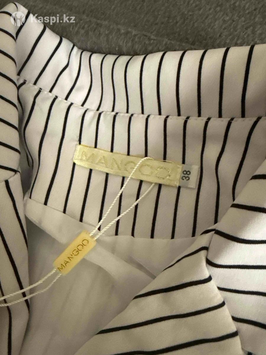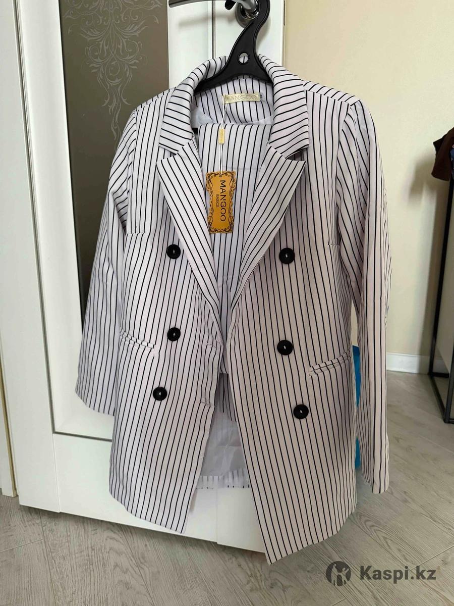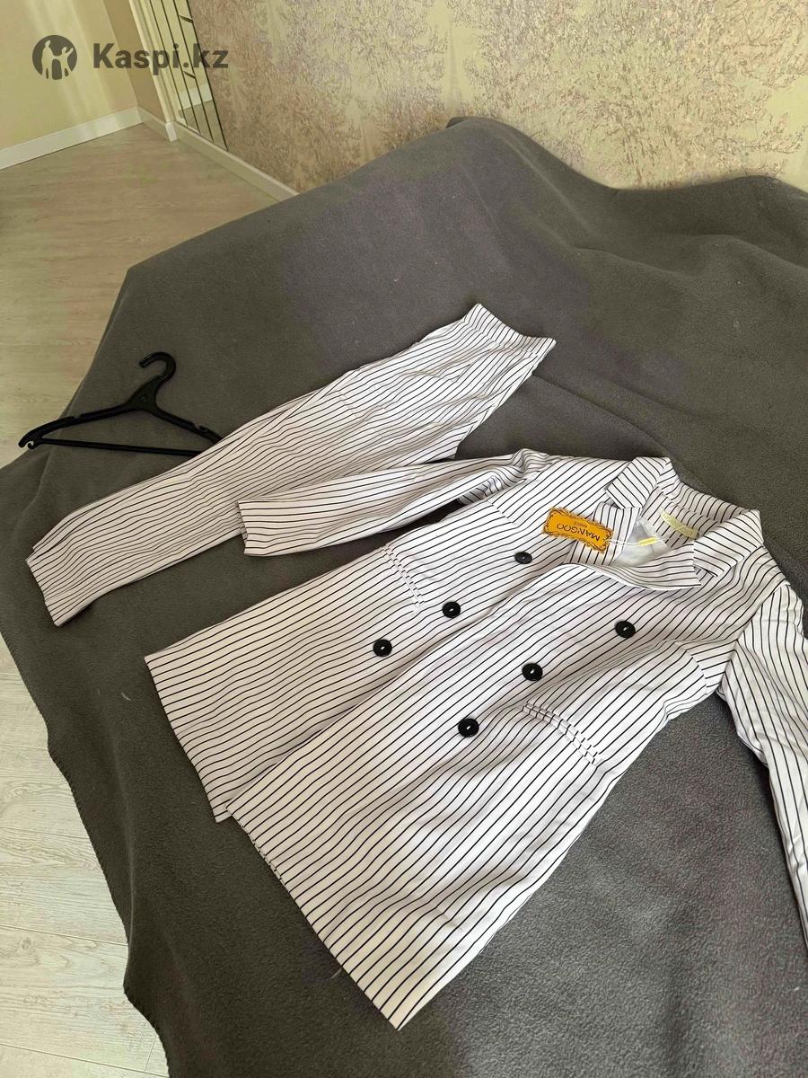 Костюм с брюками, цвет белый с черными полосками.42р новый с этикеткой. 6 пуговиц. Пиджак с подкладкой, ткань полиэстер, приятная к телу.