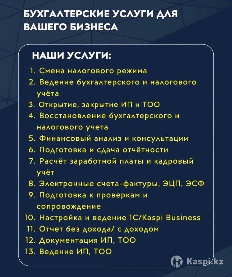 БУХГАЛТЕРСКИЕ УСЛУГИ ДЛЯ ВАШЕГО БИЗНЕСА НАШИ УСЛУГИ: 1. Смена налогового режима 2. Ведение бухгалтерского и налогового учёта 3. Открытие, закрытие ИП и ТОО 4. Восстановление бухгалтерского и налогового учета 5. Финансовый анализ и консультации 6. Подготовка и сдача отчётности 7. Расчёт заработной платы и кадровый учёт 8. Электронные счета-фактуры, , ЭСФ 9. Подготовка к проверкам и сопровождение 10. Настройка и ведение 1С/Kaspi Business 11. Отчет без дохода/ с доходом 12. Документация ИП, ТОО 13. Ведение ИП, ТОО