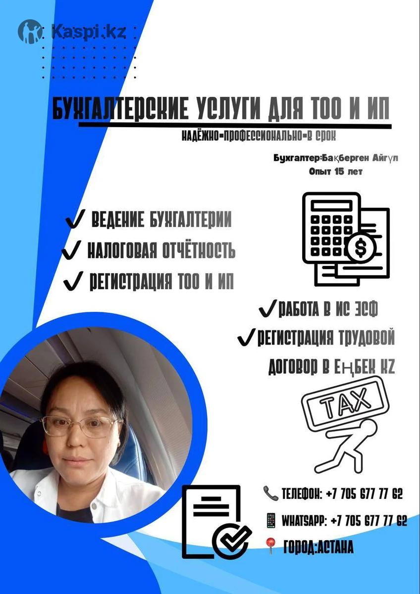 Сәлеметсіз бе, менің есімім Айгүл, 10 жылдық тәжірибесі бар кәсіби бухгалтермін Сіздің кәсібіңізге кәсіби бухгалтердің қызметі қажет болса, кәсібіңіздің бухгалтерлік жəне салықтық есебін сауатты жүргізуді қаласаңыз, Сіз жаңа ашылған мекеме иесі болсаңыз, алайда штатта бухгалтер ұстаудың қажеті жоқ деп санасаңыз, өз уақытыңызды қадірлесеңіз, артық шығын мен уайымға салынбаймын десеңіз, сізге өз қызметімді ұсына аламын Мен Сізге төмендегі қызметтер тізімі бойынша бухгалтерлік сүйелдеме жасаймын, сондай-ақ, бір реттік бухгалтерлік қызмет көрсетемін: - бухгалтерлік және салықтық есепті толық сүйемелдеу - Бухгалтерлік қызметтердің барлық түрлерін қашықтықтан атқарамын ТОО және ИП бухгалтерлік есептілігін жүргіземін 1с бухгалтерия 8.3 нұсқасымен жұмыс жасаймын Алғашқы құжаттар Салықтық есептіліктер Кадрлық мәселелер Салық органымен байланысу Өз мамандығыма байланысты басқада мәлелелермен заң аясында жұмыс жасаймын Сізге барлық қажетті бухгалтерлік қызметтер түрін уақытында жəне сапалы түрде көрсетеміз. Тізімде сізді қызықтыратын қызметті таппаған болсаңыз, сіз әрқашан + нөміріне қоңырау шала аласыз, мен сіздің сұрағыңыздың шешімін табуға тырысамын.