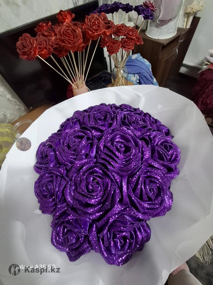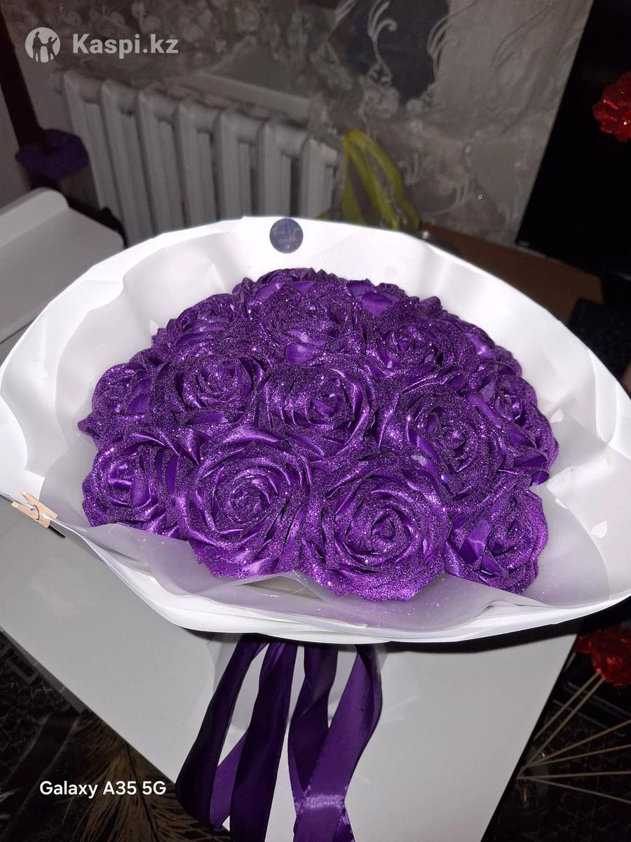 В продаже букет 15 декоративных фиолетовых роз с блеском ручной работы из атласной ленты Если вы ищете оригинальный подарок тогда эти цветы идеально подойдут, потому что они не завянут, удивят, очаруют и оставят море впечатлений!!! К букету будет небольшой подарок- презент!