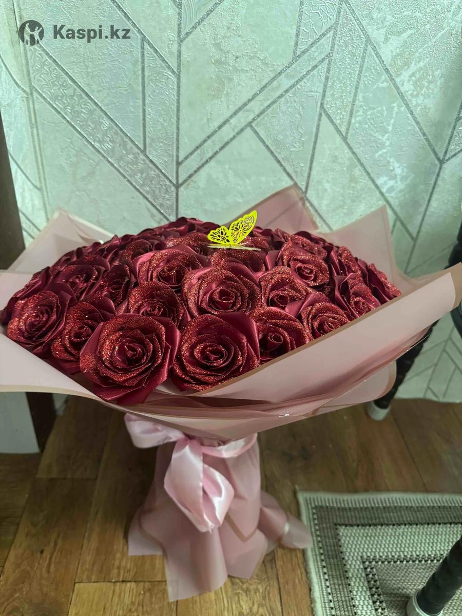 Букет из атласных лент оригинальный подарок который не завянет. Розы из атласных лент цвет бордовый. Количество 51 штук оформлен бисером